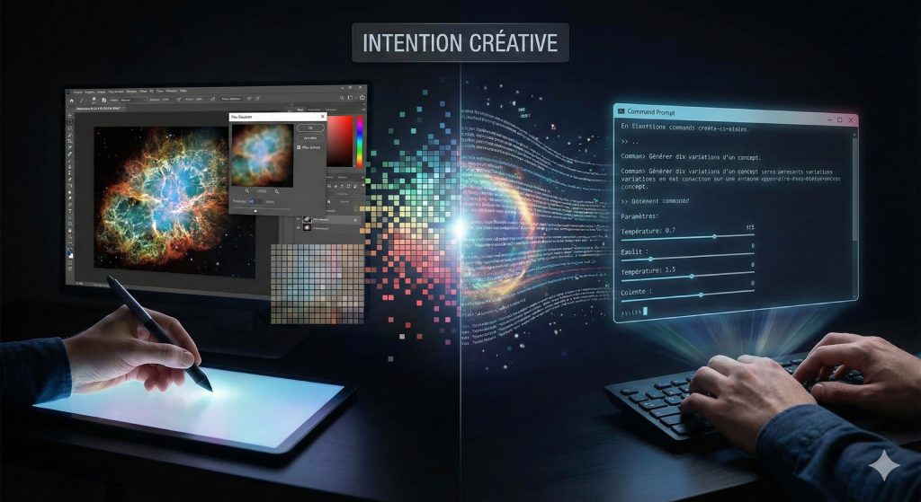 Nous acceptons que le graphiste manipule les pixels avec Photoshop, mais nous accusons l’utilisateur d’IA de paresse quand il manipule les mots. Pourquoi ce double standard ? L’IA n’est pas un remplacement, mais l’équivalent d’un outil de retouche de la pensée, tout comme Photoshop l’est pour l’image. Le talent du graphiste ou de l’opérateur d’IA ne réside pas dans l’exécution technique (déjà automatisée), mais dans l’intention et le jugement critique qui donnent le sens. Les gestes techniques se transposent du pixel au token. L’IA nous oblige à devenir des opérateurs conceptuels. L’exigence nouvelle est de ne jamais se satisfaire de la moyenne, puisque celle-ci est désormais automatisée.